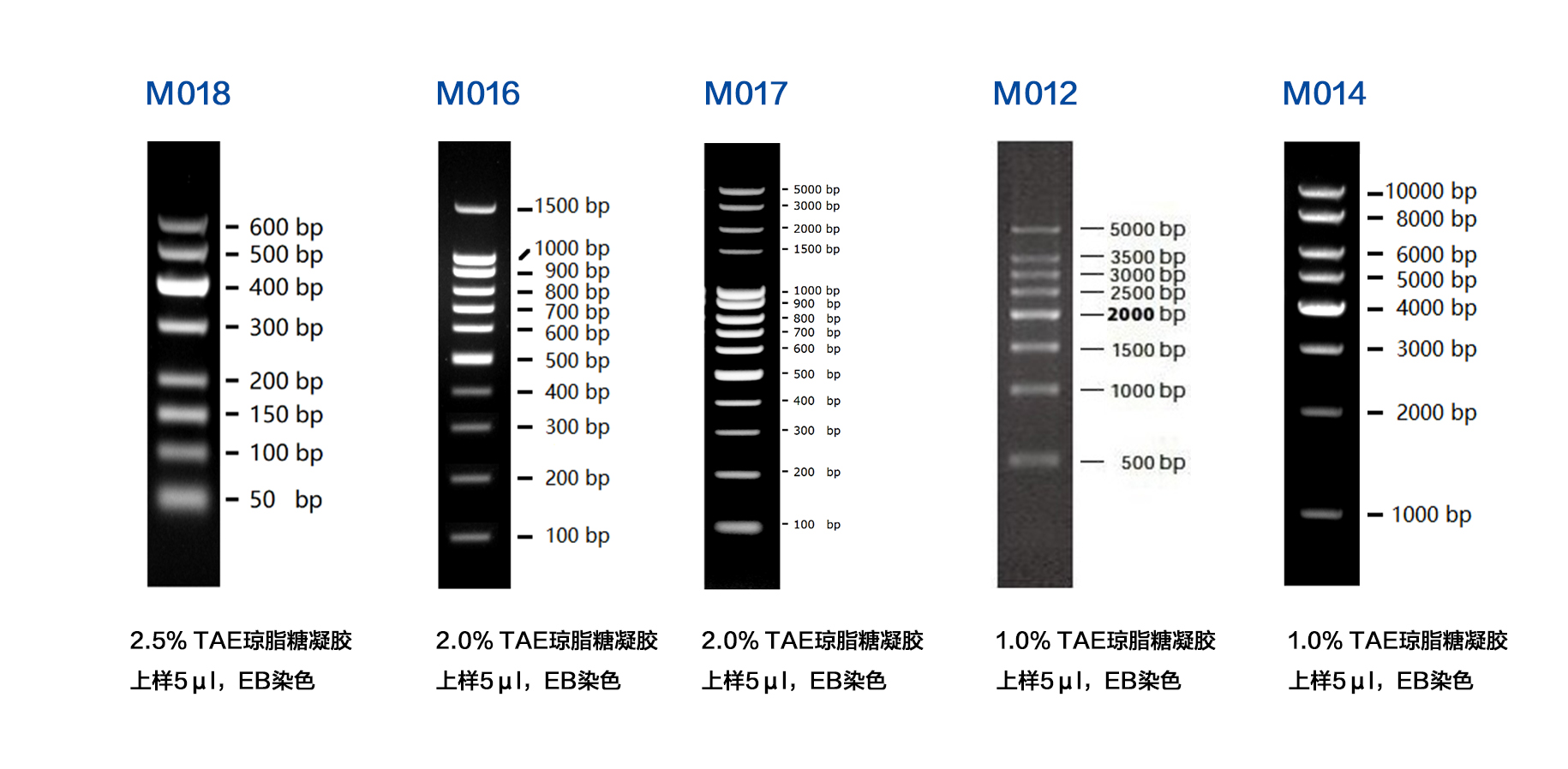 本產(chǎn)品為預(yù)混有 1x 上樣緩沖液的即用型 DNA 分子量標(biāo)準(zhǔn),由 條線狀雙鏈 DNA 條帶組成,適用于對(duì) 500-5000 bp 的雙鏈 DNA 分子大小的估算和粗略定量。本產(chǎn)品的 條帶分別為 500、1000、15002000、25003000、3500 和 5000 bp 。其中 2000 bp 條帶濃度最大,為 20 ng/µl,其余條帶濃度約為 10 ng/µl。