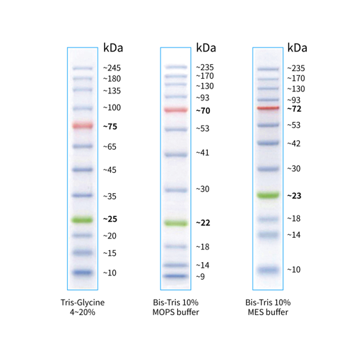 本產(chǎn)品由跨度從 10-245 kDa 的 12 種高度純化預(yù)染的重組蛋白質(zhì)組成,各條帶濃度約為 0.1-0.4 mg/ml。其中 25 kDa 條帶為綠色預(yù)染條帶,75 kDa 條帶為紅色預(yù)染條帶,方便判斷各個(gè)條帶的準(zhǔn)確位置。本產(chǎn)品適合作為 SDS-PAGE 電泳時(shí),變性蛋白樣品的分子量參照,并可實(shí)時(shí)觀察蛋白樣品的電泳分離狀況,也可用于檢測(cè) Western blot 的轉(zhuǎn)膜效率。由于共價(jià)結(jié)合的染料會(huì)影響蛋白質(zhì)分子的電泳遷移率,本產(chǎn)品僅適于粗略地估計(jì)目的蛋白樣品的分子量。