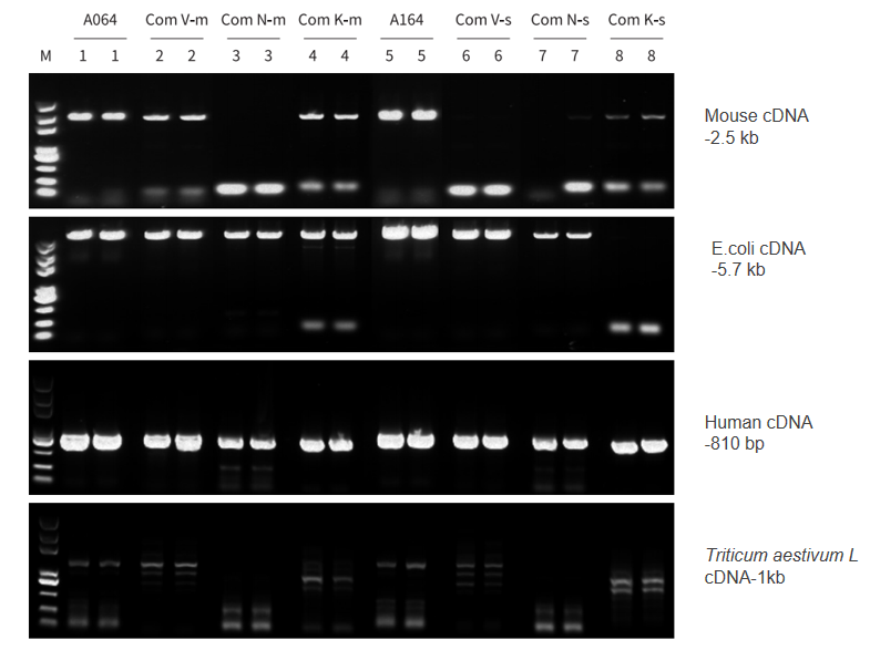分別以人、小鼠、E.coli cDNA 為模板,使用 A064/A164、Com V、Com N、Com K 進行不同長度片段擴增。結果顯示,A064/A164 對不同種屬來源不同長度的 cDNA 片段兼容性強,均能良好擴增