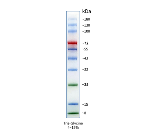 本產(chǎn)品包含了 8-180 kDa 的 10 種高度純化預染的重組蛋白質。10 種條帶分別為:8、15、25、33、43、55、72、100、130、180 kDa。其 8 kDa 和 25 kDa 條帶為綠色預染條帶,72 kDa 條帶為橙紅色預染條帶,方便判斷各個條帶準確位置。 本產(chǎn)品包裝便利,為即用型產(chǎn)品,請勿加熱、稀釋或添加還原劑。使用本產(chǎn)品可動態(tài)觀察蛋白電泳狀態(tài)和轉膜效果。經(jīng) SDS-PAGE 電泳后轉移到 PVDF 膜、NC 膜上可見清晰的彩色條帶。預染蛋白與染料結合后,在不同緩沖體系中,位置會有遷移,本產(chǎn)品在用于判斷目的蛋白分子量大小時僅供參考。
