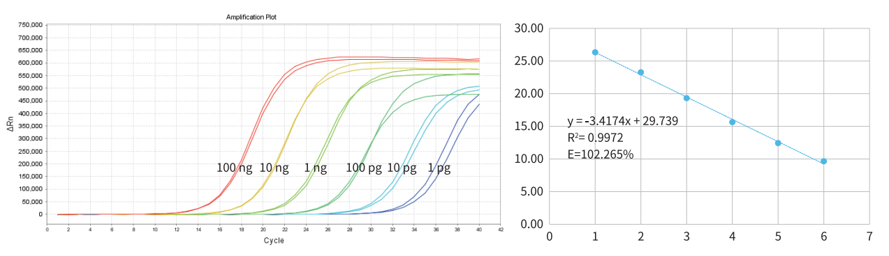以 100 ng、10 ng、1ng、100pg、10pg、1pg 的小鼠 RNA 為模板,使用 A388 進行檢測。結果顯示,A388 的檢測下限可達 1 pg,且擴增效率高