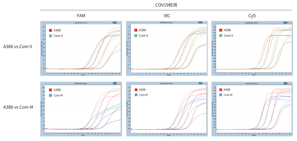 以不同濃度的 COV19 為模板,分別用 A388、 Com V 、Com M 進行檢測。結果顯示,A388 和 Com V、Com M 擴增效果相當,A388 擴增曲線和熒光強度優(yōu)于 Com M
