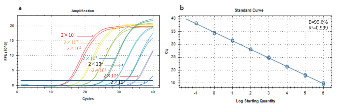 對(duì)濃度范圍為 2×101~2×108 copies/μl 的某 DNA 病毒陽性質(zhì)粒,用 GenStar #A392 進(jìn)行 qPCR 檢測(cè),結(jié)果顯示,GenStar #A392 可檢測(cè)出最低 DNA 量為 20 copies/μl。