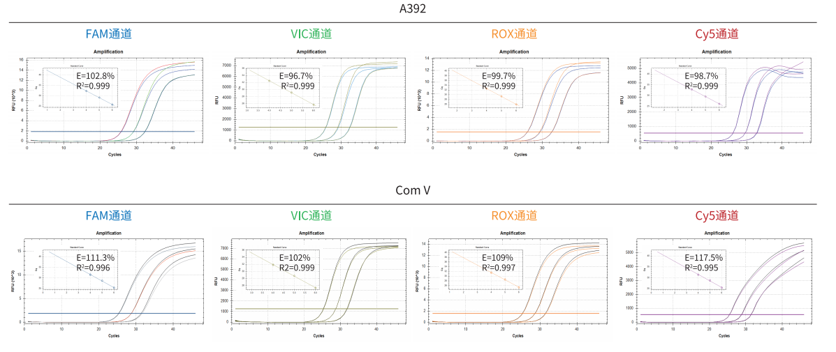 GenStar #A392 與 Com V 同時(shí)進(jìn)行四重 qPCR 檢測(cè),結(jié)果顯示,四通道檢測(cè)結(jié)果均良好,尤其 FAM、Cy5、ROX 通道擴(kuò)增效率優(yōu)于 Com V。