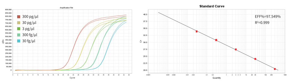 GenStar #A801 E.coli 殘留 DNA 檢測線性范圍為 30 fg/μl~300 pg/μl,線性范圍寬,靈敏度高。