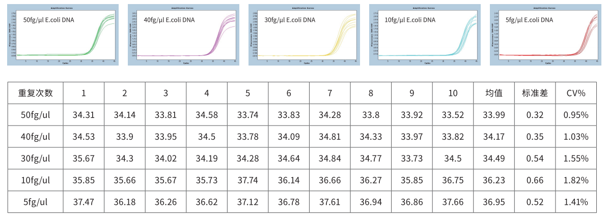 檢測濃度梯度為 50 fg/μl、40 fg/μl、30 fg/μl、10 fg/μl、5 fg/μl E.coli DNA,每個濃度梯度設置 10 個重復。30 fg/μl 及以上濃度 10 個重復 Ct 值 CV<5%,即 GenStar #A801 最低檢測限可達 30 fg/μl。