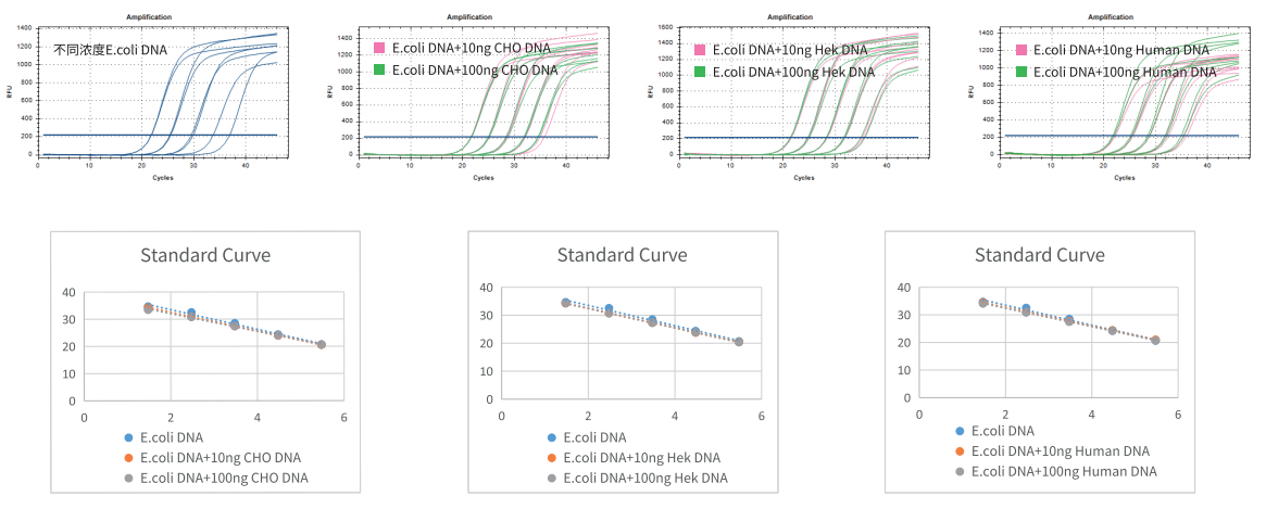 在濃度為 300 pg/μl、30 pg/μl、3 pg/μl、300 fg/μl、30 fg/μl 的 E.coli DNA 中分別加入 10 ng/100 ng CHO、Hek 和 Human DNA 作為干擾 DNA,結(jié)果顯示干擾組與對照組基本重合,可見 GenStar #A801 特異性很強,不同細胞系間無交叉反應,結(jié)果更準確。