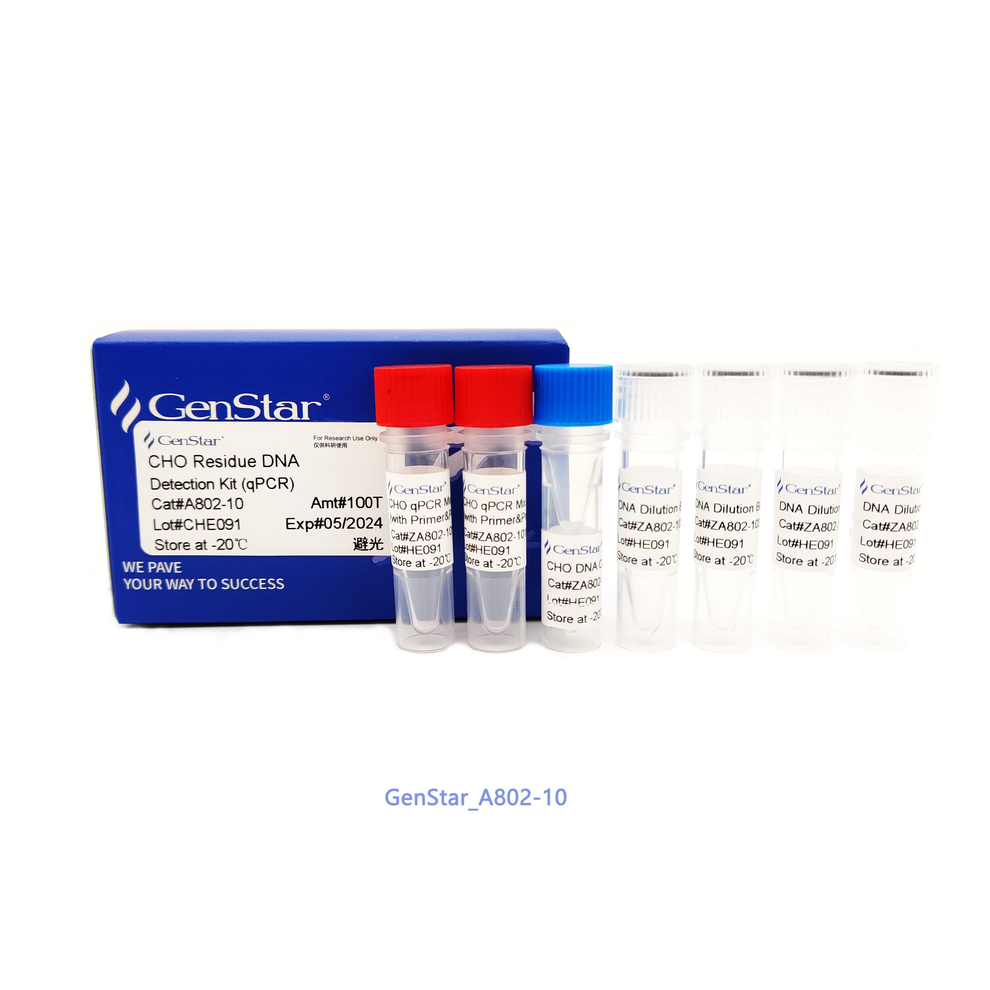 CHO 殘留 DNA 檢測試劑盒利用 TaqMan 探針法 qPCR,檢測各種生物制品及藥品的中間品、半成品和成品中的 CHO 宿主細 胞殘留 DNA。本試劑盒配套有 CHO DNA 定量參考品,濃度與國家標準品一致,特異性強、靈敏度高(可檢測 fg 級別)、檢測快速,可用于 CHO 宿主細胞殘留 DNA 的準確檢測。