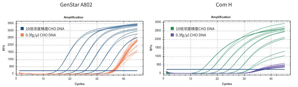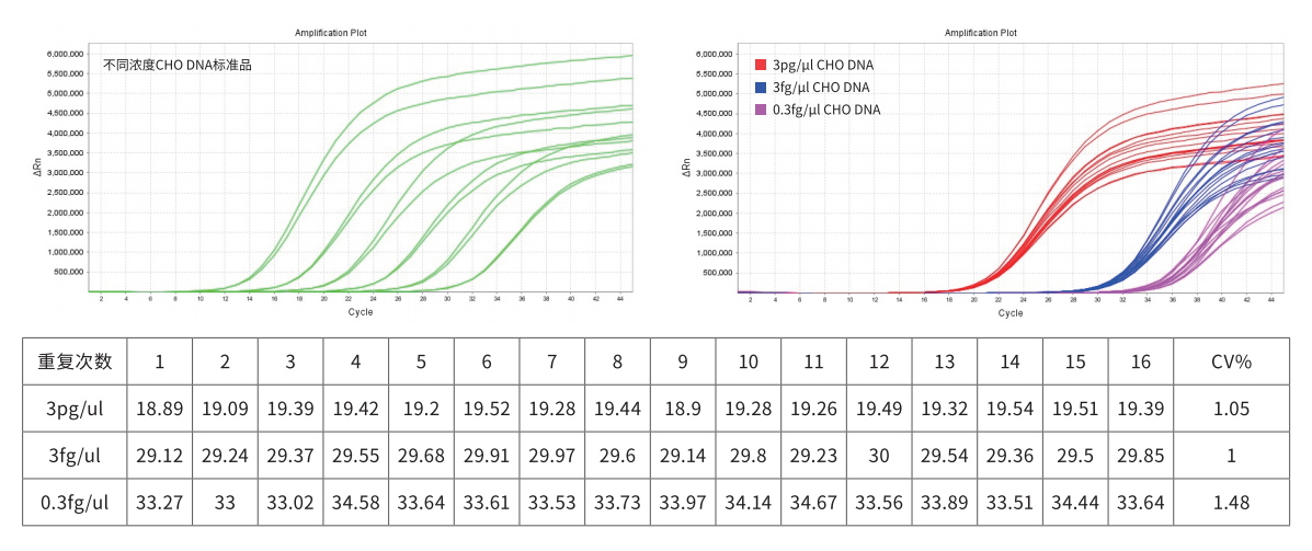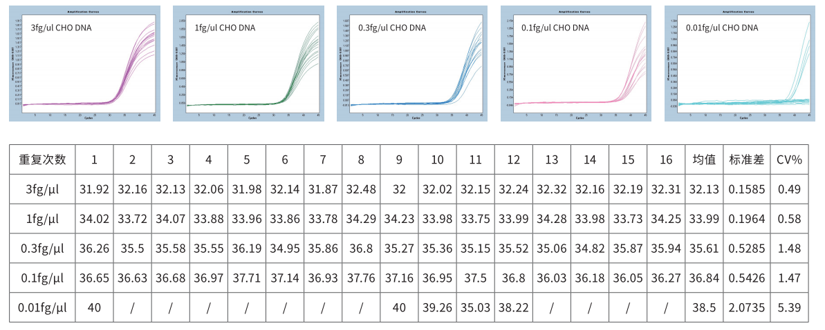 重復 16 次檢測 3 pg/μl、3 fg/μl 和 0.3 fg/μl 的CHO DNA,Ct 值 CV<5%,結果顯示 GenStar #A802 重復性好。