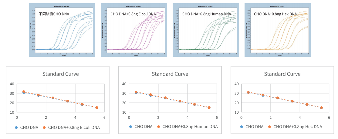 在不同濃度 CHO DNA 中分別加入 0.8 ng E.coli、Human、Hek 干擾 DNA,干擾組與對照組基本重合,未見干擾??梢?GenStar #A802 特異性很強,不同細胞系間無交叉反應,結果更準確。