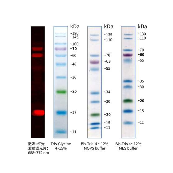 本產(chǎn)品由跨度從 11-180 kDa 的 10 種高度純化預(yù)染的重組蛋白質(zhì)組成。10 種條帶分別為:11、17、25、36、48、60、70、100、145、180 kDa。其中 25 kDa 條帶為綠色預(yù)染條帶,70 kDa 條帶為紫色預(yù)染條帶,17、60、70 kDa 三個(gè)條帶可用于紅色波長(635 nm 激光或紅色 LED )的熒光印跡檢測,方便判斷各個(gè)條帶準(zhǔn)確位置。