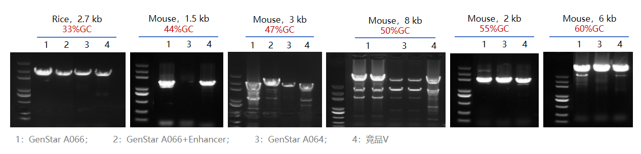 以 Mouse、Rice gDNA 為模板,使用 GenStar A066 和 GenStar A064、競(jìng)品 V 分別擴(kuò)增不同 GC 含量的目標(biāo)片段。