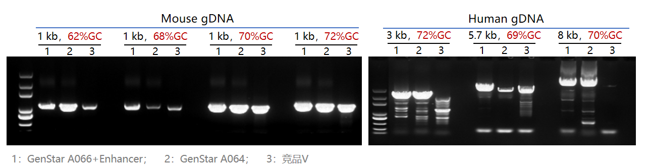 以 Mouse、Human gDNA 為模板,使用 GenStar A066 和 GenStar A064、競(jìng)品 V 分別擴(kuò)增不同 GC 含量的目標(biāo)片段。
