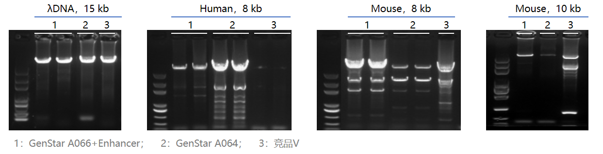 以 λDNA、Human gDNA、Mouse gDNA 為模板,使用 GenStar A066、A064 和競(jìng)品 V 三種高保真 DNA 聚合酶分別擴(kuò)增 15kb、8kb、10kb 的片段。