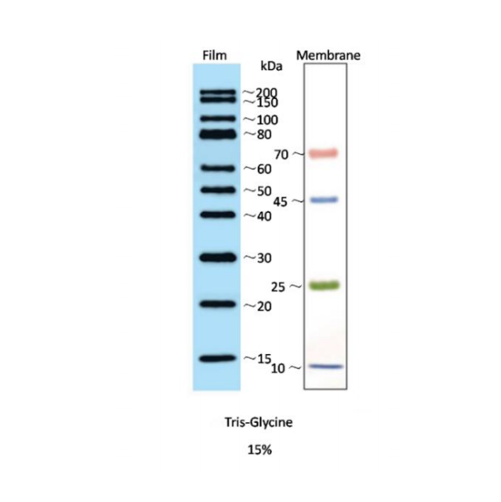 本產(chǎn)品由跨度從 10-200 kDa 的 14 種純化的天然蛋白混合而成。其中 25 kDa 條帶為綠色預(yù)染條帶、10 kDa 和 45 kDa 條帶為藍色預(yù)染條帶、70 kDa 條帶為粉色預(yù)染條帶,便于動態(tài)觀察電泳狀態(tài),方便判斷各個條帶的準確位置和轉(zhuǎn)膜效果。其他 10 條條帶含有多種 IgG 亞型結(jié)合位點,可以和目的蛋白條帶同時結(jié)合抗體,用相同抗體來檢測,經(jīng)化學發(fā)光檢測或者通過 CCD 成像后顯示 15 kDa、20 kDa、30 kDa、40 kDa、50 kDa、60 kDa、80 kDa、100 kDa、150 kDa、200 kDa 條帶。