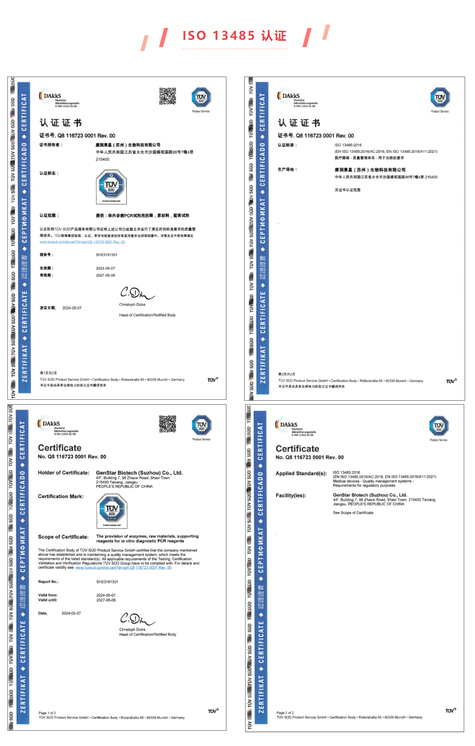 近日,康潤景星(蘇州)生物科技有限公司(GenStar全資子公司)經(jīng)國際第三方檢測認(rèn)證機構(gòu)TÜV南德意志集團(以下簡稱“TÜV南德”)的嚴(yán)格審查,再次通過ISO9001:2015質(zhì)量管理體系ISO13485:2016醫(yī)療器械質(zhì)量管理體系認(rèn)證審核,并獲得證書。